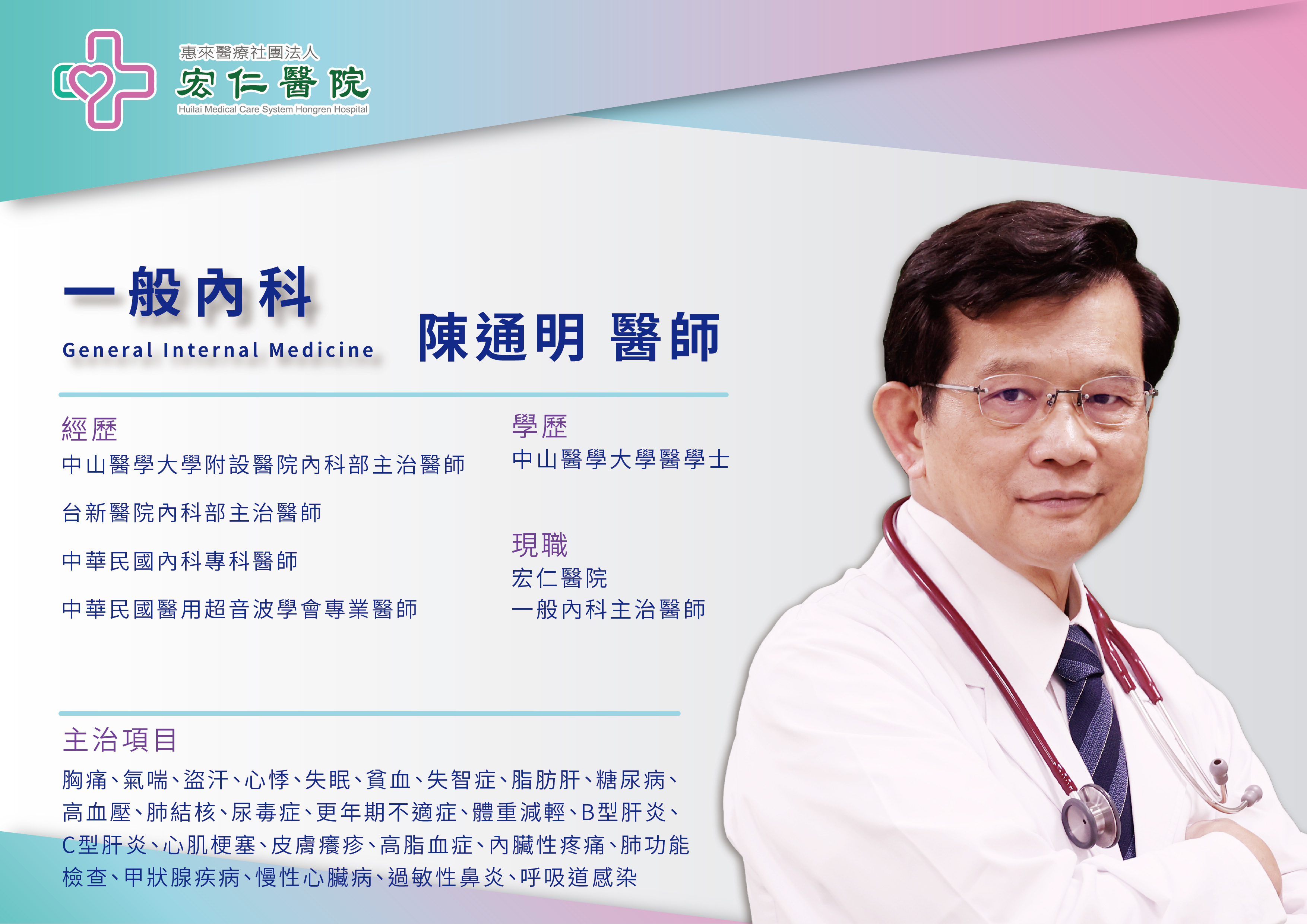 【一般內科】 陳通明醫師 →現在立即掛號 現任/ 宏仁醫院一般內科主治醫師 經歷/中山醫學大學附設醫院內科部主治醫師台新醫院內科部主治醫師中華民國內科專科醫師中華民國醫用超音波學會專業醫師 主治項目/胸痛、氣喘、盜汗、心悸、失眠、貧血、失智症、脂肪肝、糖尿病、高血壓、肺結核、尿毒症、更年期不適症、體重減輕、B型肝炎、C型肝炎、心肌梗塞、皮膚癢疹、高脂血症、內臟性疼痛、肺功能檢查、甲狀腺疾病、慢性心臟病、過敏性鼻炎、呼吸道感染