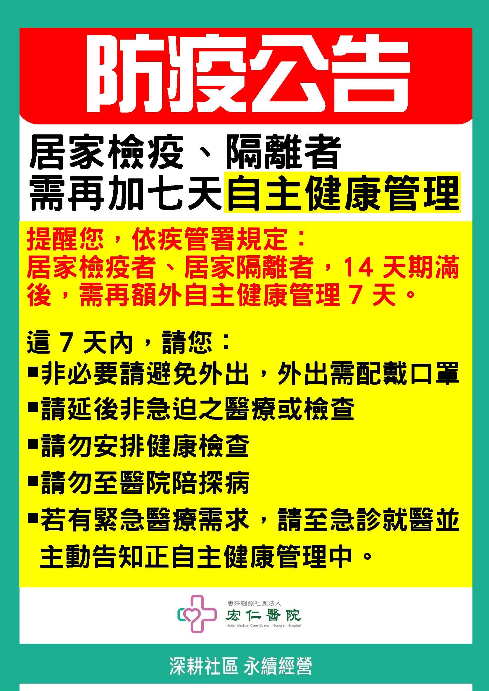 【防疫公告】居家檢疫、居家隔離加7天自主健康管理
